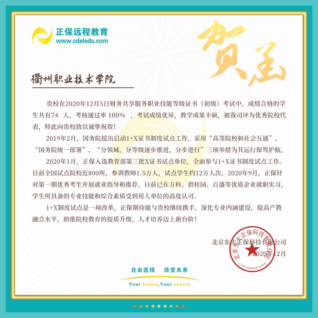 近日,北京东大正保科技有限公司(教育部第三批X证书试点单位)给我校发来贺函,祝贺我校在会计专业“1+X”职业技能等级证书“财务共享服务”考试中74名考生全部合格、考核通过率100%,被评为优秀院校代表。