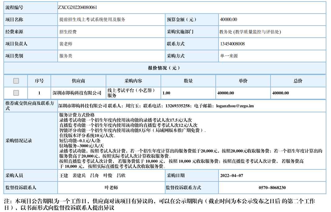 开元网页版提前招生线上考试自行采购信息公示