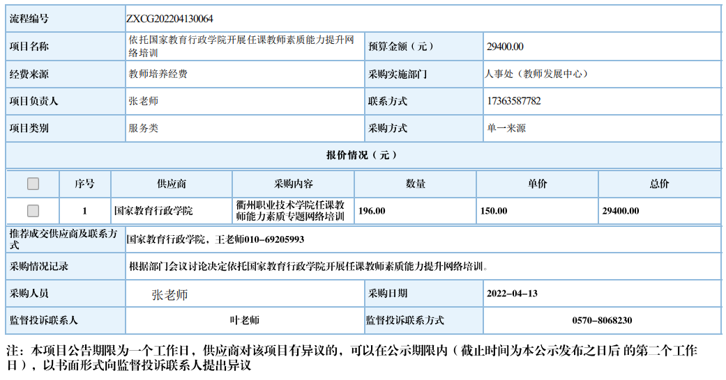 开元网页版依托国家教育行政学院开展任课教师素质能力提升网络培训自行采购公示