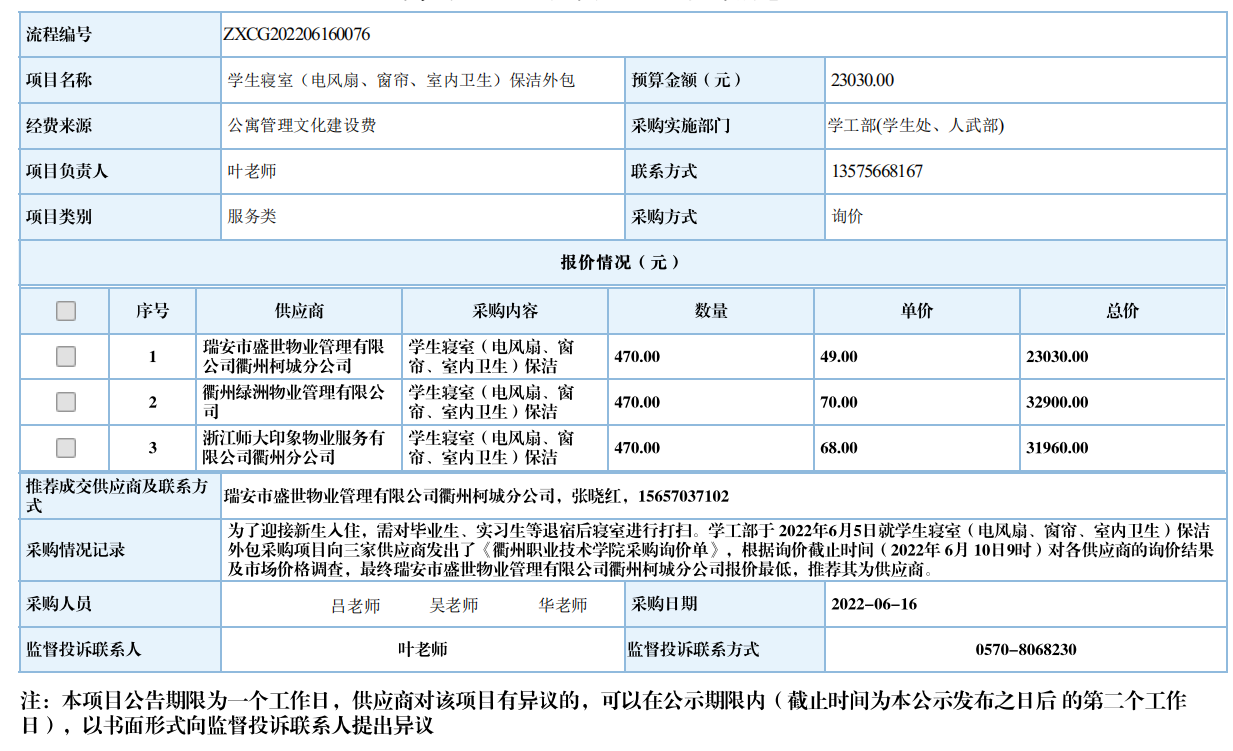 开元网页版学生公寓(电风扇、窗帘、室内卫生)保洁外包自行采购信息公示