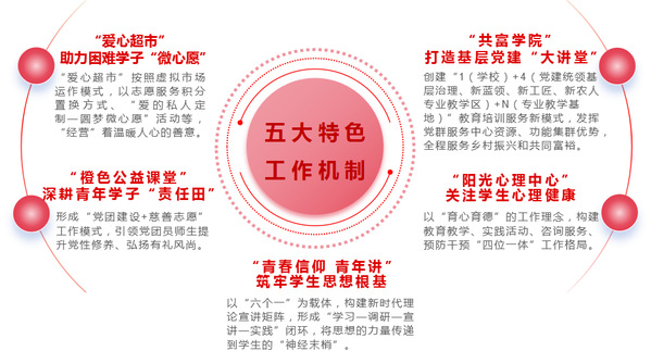 通过“爱心服务+窗口服务+网络服务+自助服务”开通“520党群服务项目”,践行“一站式”“最多跑一次”服务理念。省高校思政工作精品项目“青春信仰青年讲”,开展宣讲500余场,受众4.5万余人次,被市级以上媒体报道60余次;爱心超市志愿服务积分兑换每年1500人次、6000件“爱心物品”、实践时长70000余小时;共富学院开展“三衢工匠”评定5000余人/年,“三新”群体育训7.5万人次,推进四省边际职业教育联盟扩容至60余家,获国家教学成果二等奖;开展橙色公益活动,开设“衢职先锋 职教惠民”公益课堂和特殊青少年职教技能培训等,志愿服务项目获省、国家奖项14个,组织获评全国计划生育协会工作先进单位、省教育系统“最美志愿服务组织”。