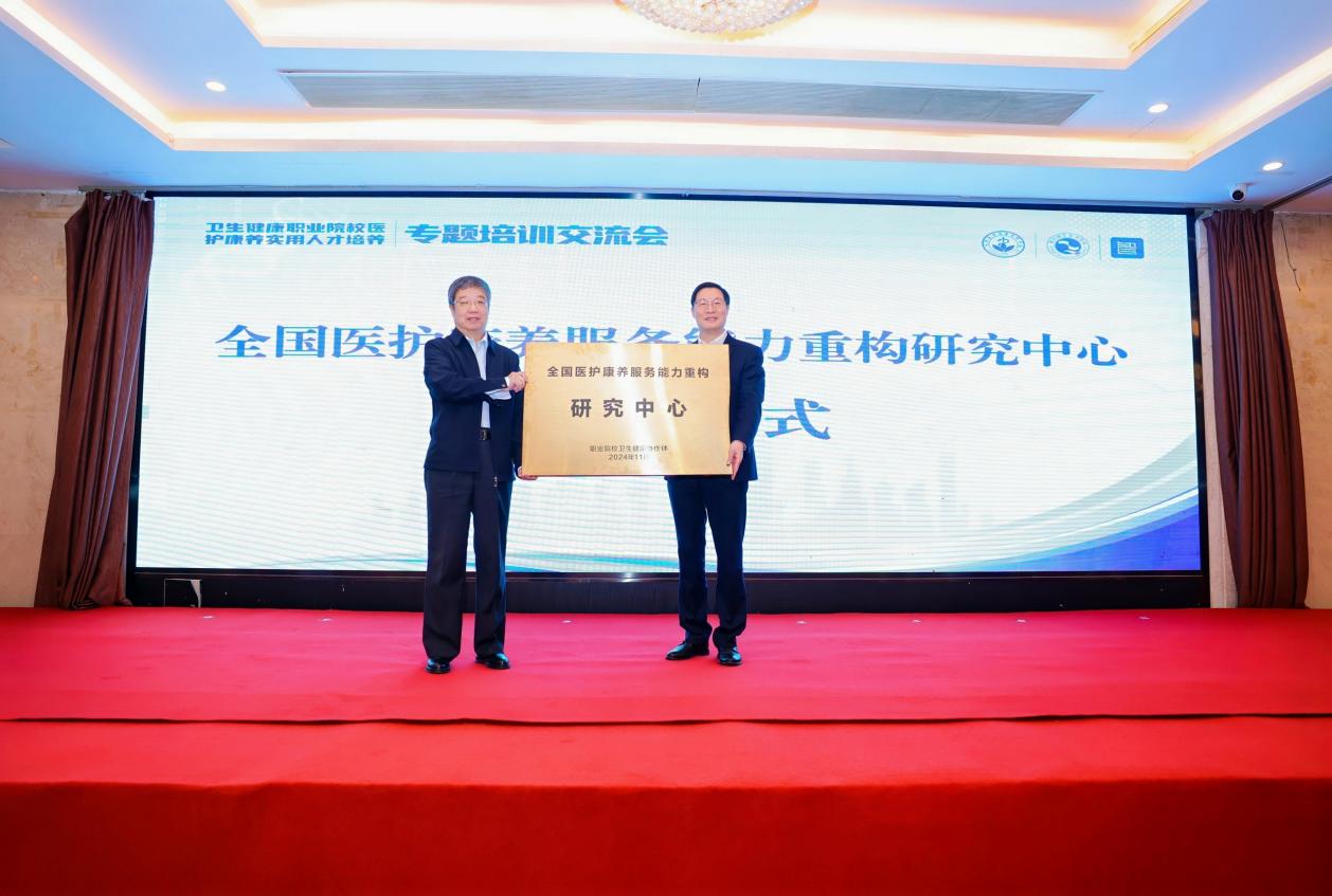 11月30日,全国医护康养服务能力重构研究中心在我校成立。全国卫生健康职业教育教学指导委员会副主任委员、天津医学高等专科学校校长张彦文,金华职业技术大学原党委副书记、浙闽赣皖医护康养服务能力重构研究中心主任胡野,全国卫生健康行指委助产专业分委会主任委员、承德护理职业学院党委副书记、校长单伟颖,我校党委书记徐须实等出席成立启动仪式。