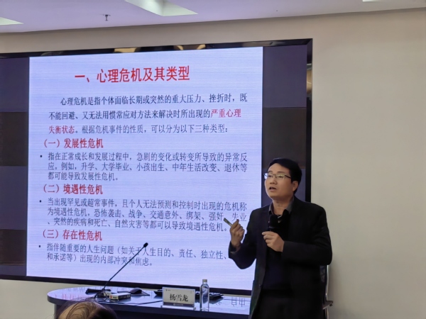 培训由中国心理学会注册心理师、浙江省高校心理咨询专业委员会委员、浙江师范大学学工部副部长杨雪龙副教授主讲。杨老师从“心理危机及其影响”“正确理解青少年心理危机”以及“做好危机‘守门人’”等三项内容进行讲解。
