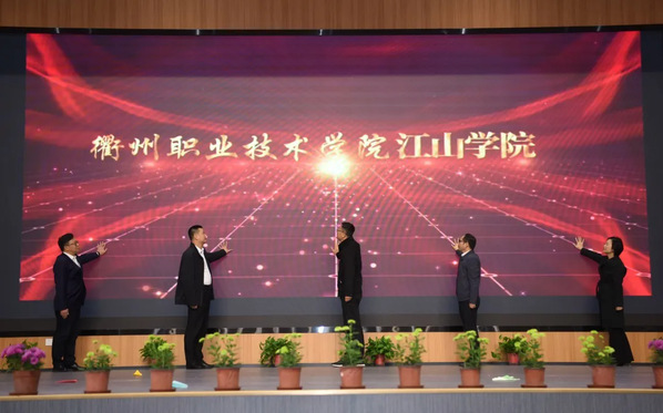 校党委副书记、校长吕延文,衢州市教育局党委委员、副局长徐丰民,江山市人民政府副市长王展,江山市教育局党委书记、局长郑李慧,衢州第二中等专业学校党委书记徐凌志共同为开元网页版江山学院揭牌。