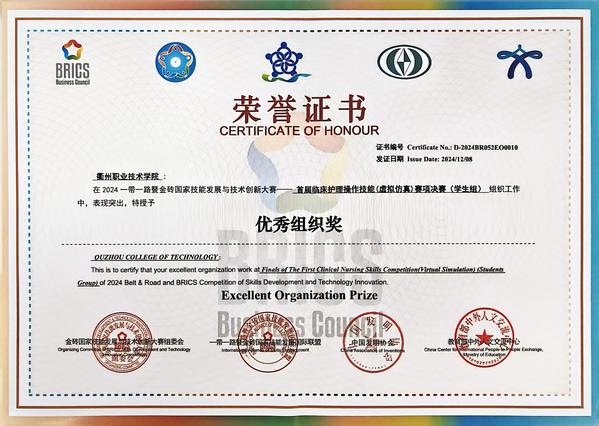 一带一路暨金砖国家技能发展与技术创新大赛由金砖国家工商理事会中方理事会、一带一路暨金砖国家技能发展国际联盟、金砖国家技能发展与技术创新培训中心主办。2024年第八届一带一路暨金砖国家技能发展与技术创新大赛首次将临床护理操作技能(虚拟仿真)纳入金砖系列赛项,该赛项旨在积极推动虚拟仿真技术在金砖五国和一带一路范围内国家的发展与应用,提升临床及护理专业师生的职业核心能力,树立虚拟仿真实训标杆,聚焦临床与护理实践核心技能,以促进临床思维培养为宗旨,全面考查学生基于典型工作任务的核心技能、职业素养等职业胜任能力。