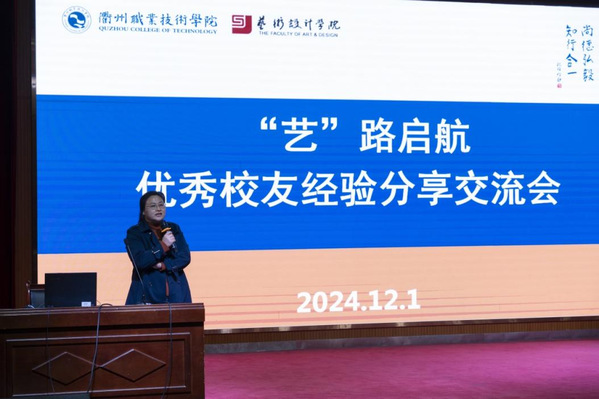 艺术设计学院党总支副书记范洪梅发表讲话,“四位优秀校友虽然步入职场不久,但都取得了不错的成绩,或在设计公司崭露头角,或在自主创业中取得了长足进步。他们用亲身经历,详细讲述了工作中的点滴体会以及创业路上的艰辛与成就,鼓励学弟学妹们定好目标,持之以恒。”