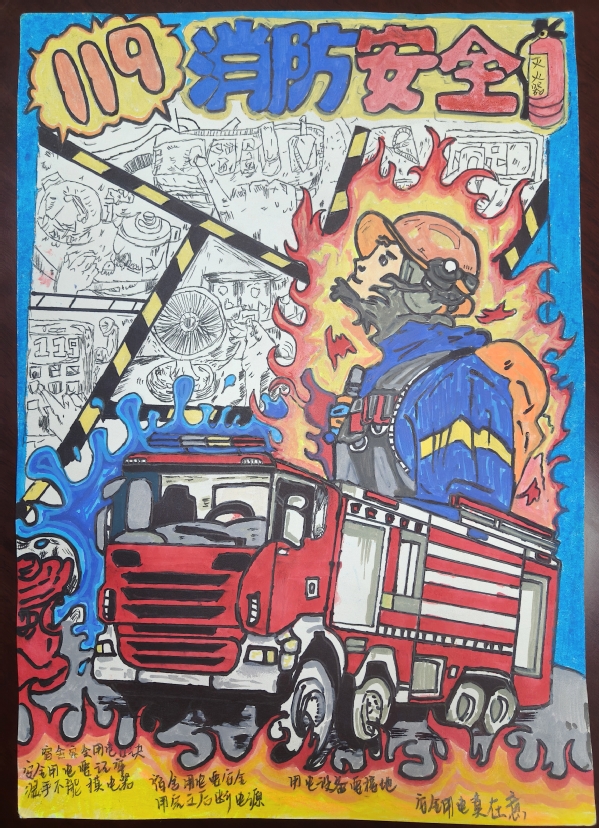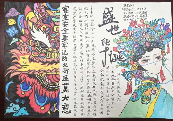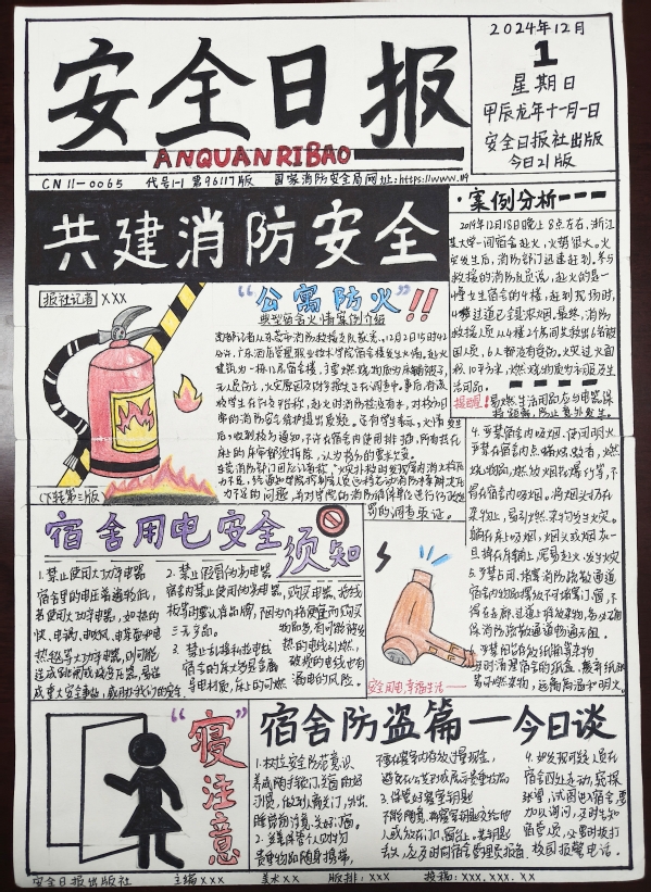 活动邀请同学们围绕学生公寓安全的多个方面展开创作。在创作过程中,同学们尽情挥洒创意,运用了彩色铅笔、水彩、剪贴画等多种艺术手法,将原本枯燥的安全知识转化为一幅幅色彩斑斓、生动有趣的手抄报。有的作品以消防安全为主题,通过生动的火灾逃生场景描绘,提醒同学们时刻保持警惕;有的作品则聚焦于用电安全,用形象直观的漫画形式展示了正确用电的重要性;还有的作品结合防盗防骗知识,巧妙融入智斗骗子的故事情节,既富有教育意义又引人入胜。