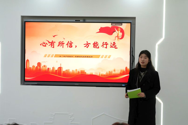 “从当年的马克思、陈望道、华岗到今天的‘8090’,一代又一代的青年在《共产党宣言》的指引下,为了民族复兴前赴后继……如今的我们,站在两个一百年奋斗目标的历史交汇点上,使命光荣,任务艰巨。”00新时代理论宣讲团成员洪橙紫在《心有所信 方能行远》中感慨到。