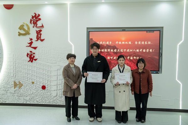 衢州市语委办专职干部、市普通话培训测试中心负责人林哲慧,衢州市文化馆文学干部、研究馆员毛芦芦为冯梦瑜、王鸿宇2位同学颁发2024-2025学年第一学期宣讲工作优秀宣讲团团长证书。
